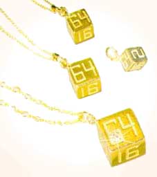 The 1/2 inch cube can be set with precious stones. It has a 24 inch 14k chain and is shown with a diamond inset. Other chains are 18 inches long. All chains are 14k gold.