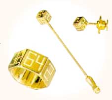Contemplate your next double with our 14k backgammon ring. Our rings are unique and can be made in any size. Our doubling cube stickpin is solid 14k also. Be 'doubly' sure your tie is in place with our solid 14k gold tie pin. All are of the finest materials and workmanship.
